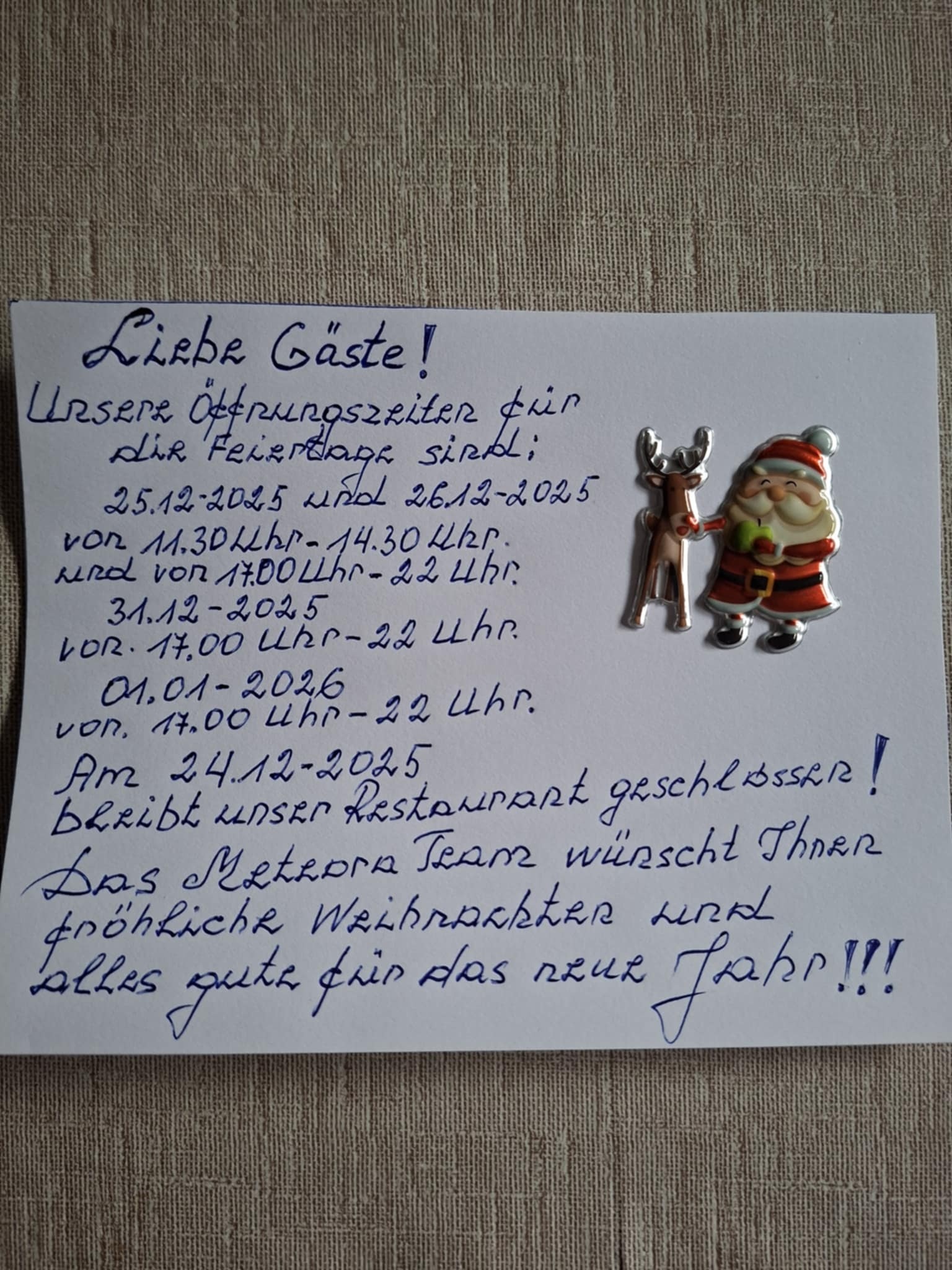Sie herzlich willkommen heißen in unserem warmen und gastfreundlichen Bereich unseres Restaurants Meteora. Hier können Sie unsere leckere und gesunde griechische Gerichte die mit liebe für Euch vorbereitet wurden, genießen.